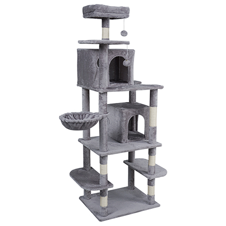 ———– CARACTERISTICI PRINCIPALE ———– Bază mare și stabilă Stâlp de zgâriat acoperit cu pluș Șase stâlpi de zgâriat din sisal Două căsuțe, inclusiv una cu fereastră Un pat deasupra și un pat rotund suplimentar Două pompoane de pluș cu clopoței pe o sfoară Poate fi atașat de perete ———- DATE TEHNICE ———- Lungime: 60 cm Lățime: 49 cm Înălțime: 173 cm Diametrul patului de sus: 28 cm Diametrul patului rotund: 28 cm Greutate: 18,2 kg Material: PAL E1, pluș